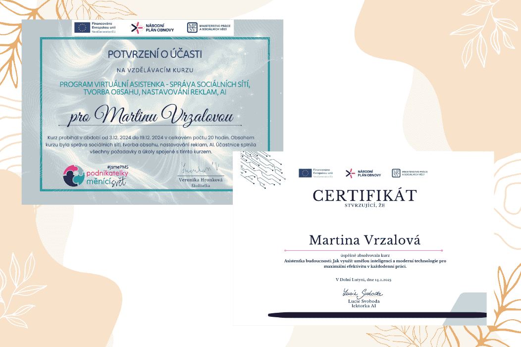 Využívám moderní digitální nástroje jako je např. Google Workspace, Canva, OpenAI, Trello aj. Mám certifikát virtuální asistentky a absolvovala jsem AI kurz. Díky tomu zvládnu plnění úkolů rychle a bez zbytečných zádrhelů.